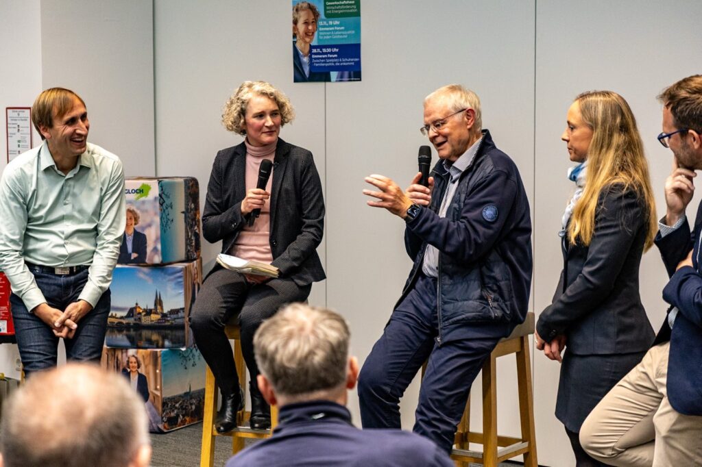 Die Podiumsgäste Prof. Dr.-Ing. Michael Sterner (OTH Regensburg) und Jochen Scherrer (Bürger-Energie Region Regensburg eG) standen für Regensburg als Kompetenzzentrum für Energiespeichertechnologien. Der Netzausbau sei eine Engstelle bei der Energiewende. Mehr regenerativer Strom müsse vor Ort erzeugt und direkt verbraucht werden, um die Netze zu entlasten und unabhängiger zu werden. Um Überschüsse und Flauten auszugleichen, brauche es Energiespeicher. Herr Scherrer nannte als Beispiel das Projekt „Energieareal Ost“ (ERO+), wo die BERR im Auftrag der Stadt einen Solarpark und einen Wasserstoff-Elektrolyseur baut. Der Strom wird direkt von den benachbarten Großunternehmen abgenommen und die Abwärme des Elektrolyseurs wird die Wohnungen im neuen Stadtviertel an der Prinz-Leopold-Kaserne beheizen. Auch Mieterstromprojekte gingen in diese Richtung. Manche Auflagen des Denkmalschutzes seien aber hinderlich für die Energiewende.